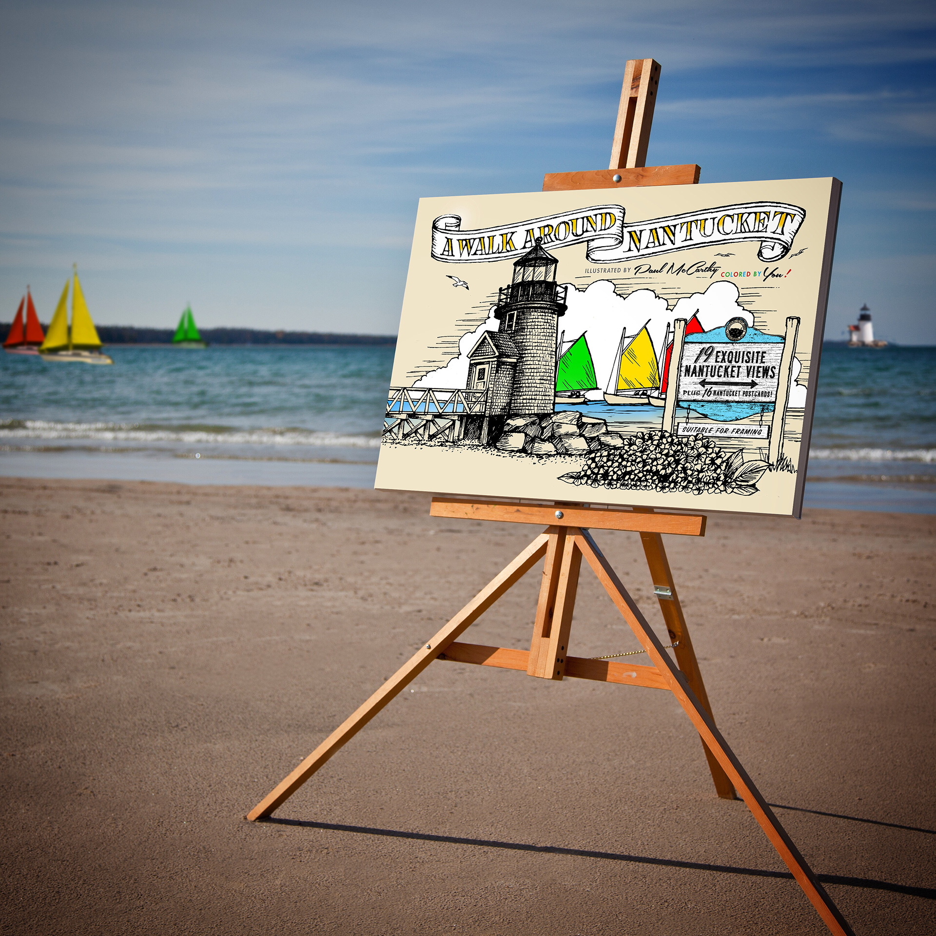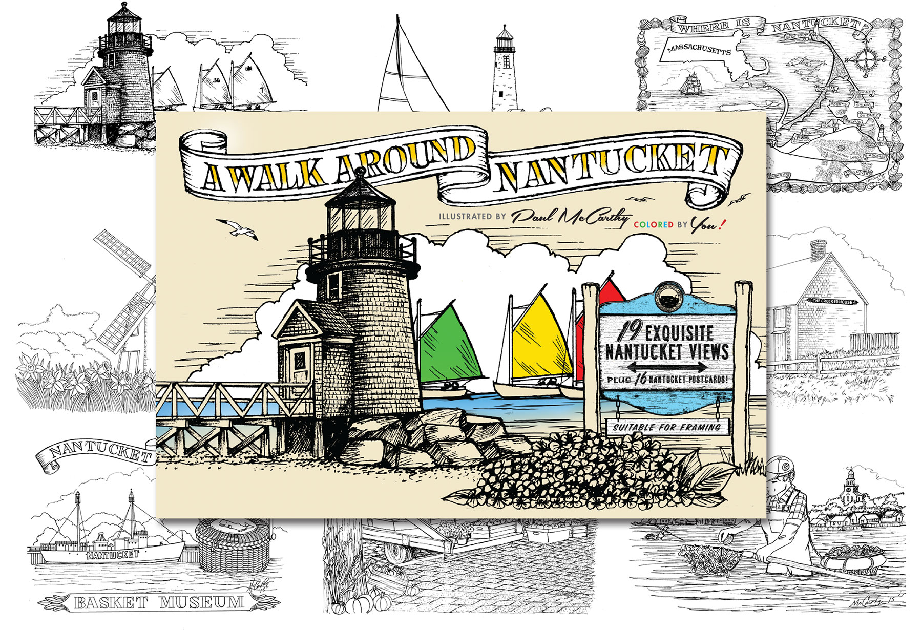 One of America's favorite travel destinations—Nantucket Island—now has its own adult coloring book…"A Walk Around Nantucket" was designed for Scott Widmeyer and Alan Yount, who were the visonaries of the project. The illustrations were executed by local artist Paul McCarthy from Nantucket Carving and Folkart. This 54 page book that includes 19 iconic scenes from around Nantucket (the three lighthouses, a typical Sconset cottage, the Crooked House in Madaket, the Windmill, and many others) and includes 16 post cards with these exquisite Nantucket scenes, also ready for coloring.